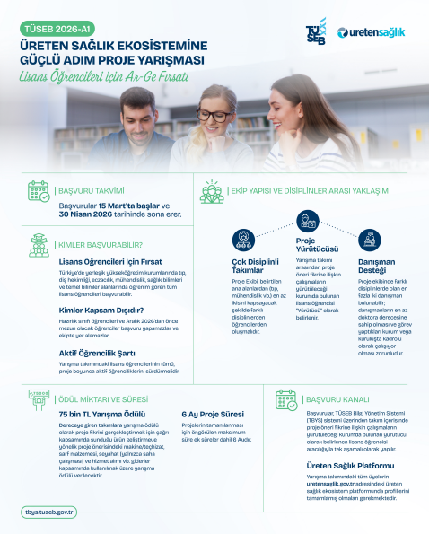 Sağlık Bakanlığının ilgili kuruluşu olan Türkiye Sağlık Enstitüleri Başkanlığı (TÜSEB) tarafından Cumhurbaşkanlığı Kararnamesinde belirlenen görevler ve kalkınma planı dikkate alınarak sağlık bilim ve teknolojileri alanında ülkemizde üreten ekosistem kültürünün geliştirilmesine öncülük yapma ve sağlık alanında araştırma faaliyeti yürüten ekipleri güçlendirme hedefleri doğrultusunda Türkiye Sağlık Enstitüleri Başkanlığı Ödül Yönetmeliğinde yer alan hükümler çerçevesinde yarışma ödülleri verilmektedir. Bu itibarla, Üniversitelerde öğrenim görmekte olan lisans öğrencileri tarafından tıp, diş, eczacılık, veterinerlik, mühendislik, sağlık bilimleri ve temel bilimler alanından en az ikisini kapsayacak şekilde oluşturulan ekiplerin kısa süreli özgün ve yenilikçi araştırma proje fikri üreterek AR-GE ekosistemine dahil olması için teşvik edilmesi, lisans öğrencilerinin akademik çalışmalarına ve bilimsel araştırmalarına lisans düzeyinden itibaren başlamalarına olanak sağlanması amacıyla 2026-A1 kodlu Lisans Öğrencilerine Yönelik Üreten Sağlık Ekosistemine Güçlü Adım Proje Yarışma Çağrısı açılmıştır.
