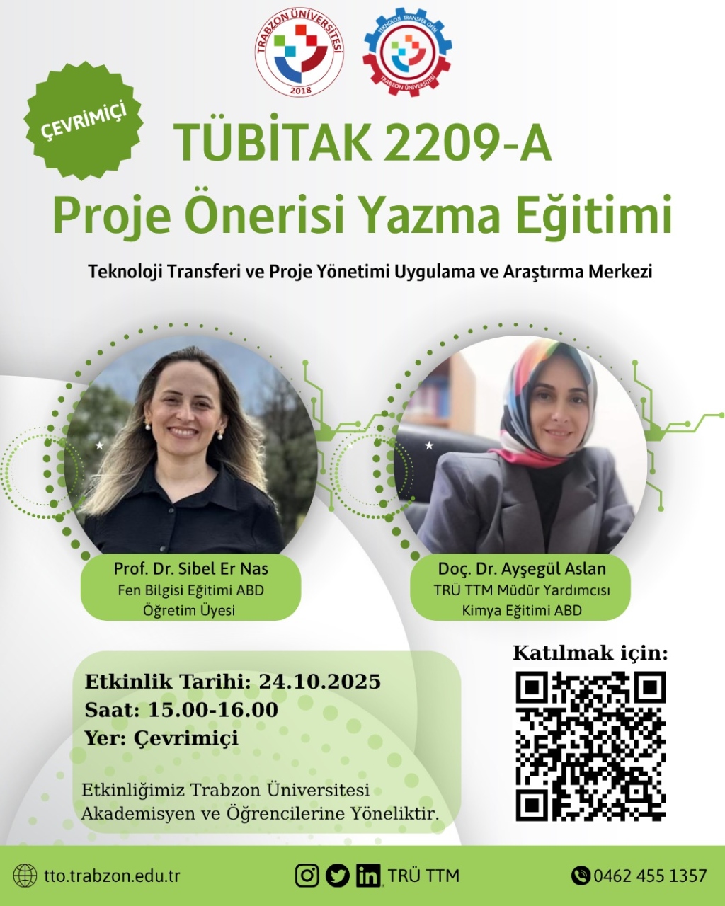 Trabzon Üniversitesi Teknoloji Transferi ve Proje Yönetimi Uygulama ve Araştırma Merkezi (TTO) tarafından, üniversitemiz akademisyenleri ve öğrencilerine yönelik olarak “TÜBİTAK 2209-A Proje Önerisi Yazma Eğitimi” düzenlenecektir.