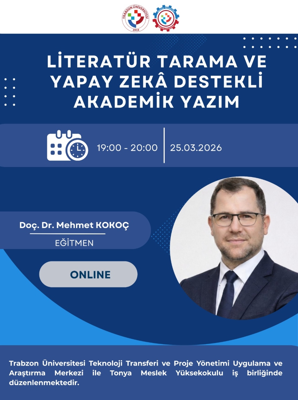 Trabzon Üniversitesi Teknoloji Transferi ve Proje Yönetimi Uygulama ve Araştırma Merkezi (TTO) ile Tonya Meslek Yüksekokulu iş birliğinde, akademik çalışmalarda literatür tarama ve yapay zekâ araçlarının etkin kullanımına yönelik “Literatür Tarama ve Yapay Zekâ Destekli Akademik Yazım” eğitimi düzenlenecektir.