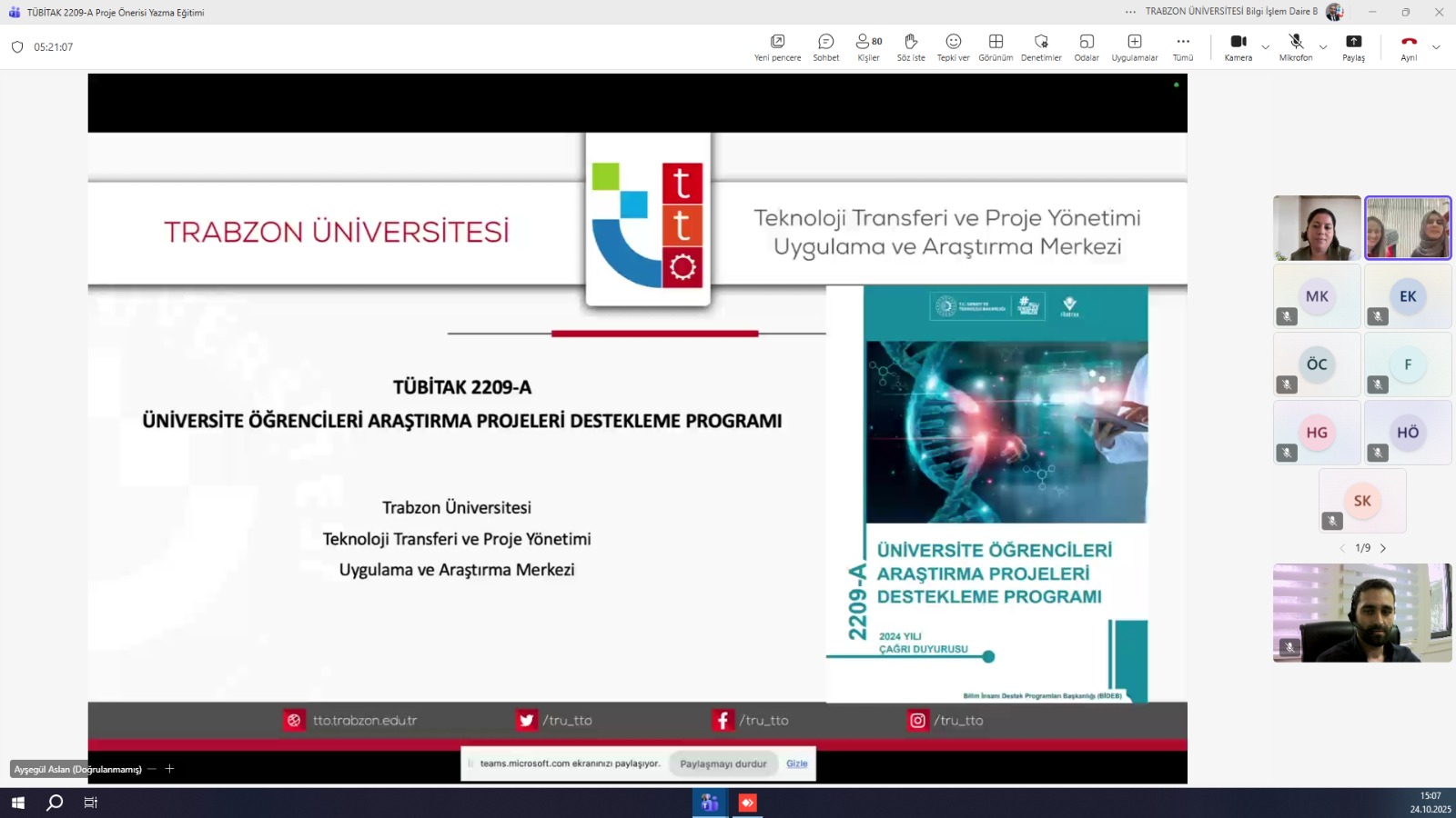 Trabzon Üniversitesi Teknoloji Transferi ve Proje Yönetimi Uygulama ve Araştırma Merkezi (TTM) tarafından, üniversitemiz akademisyenleri ve öğrencilerine yönelik olarak düzenlenen “TÜBİTAK 2209-A Proje Önerisi Yazma Eğitimi” 24 Ekim 2025 tarihinde çevrimiçi olarak gerçekleştirildi.