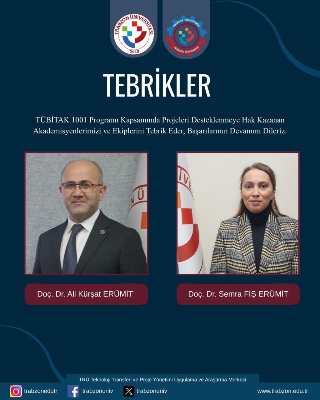 TÜBİTAK 1001 Bilimsel ve Teknolojik Araştırma Projelerini Destekleme Programı kapsamında üniversitemizden iki adet proje desteklenmeye hak kazanmıştır. Projeleri desteklenen akademisyenlerimizi ve proje ekiplerini tebrik eder, başarılarının devamını dileriz.