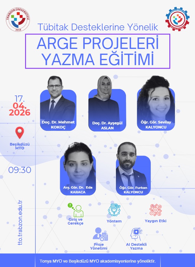 Eğitim programı; Müdürümüz Doç. Dr. Mehmet KOKOÇ, Müdür Yardımcımız Doç. Dr. Ayşegül ASLAN, Arş. Gör. Dr. Eda KARACA, Öğr. Gör. Furkan KALYONCU ve Öğr. Gör. Sevilay KALYONCU’nun katkılarıyla gerçekleştirildi. Programa, Tonya Meslek Yüksekokulu ile Beşikdüzü Meslek Yüksekokulu akademik personelleri katılım sağladı. Tüm gün süren eğitim çerçevesinde; proje fikri oluşturma aşamaları, proje yazım yöntemleri, ulusal fonlara erişim imkânları ile proje başvuru süreçlerinde göz önünde bulundurulması gereken noktalar ele alındı. Eğitim boyunca akademisyenler, proje hazırlama ve geliştirme süreçlerine dair bilgi ve tecrübelerini paylaşma imkânı bulurken, farklı birimlerden gelen katılımcılar arasında akademik iş birliği fırsatları da değerlendirildi.